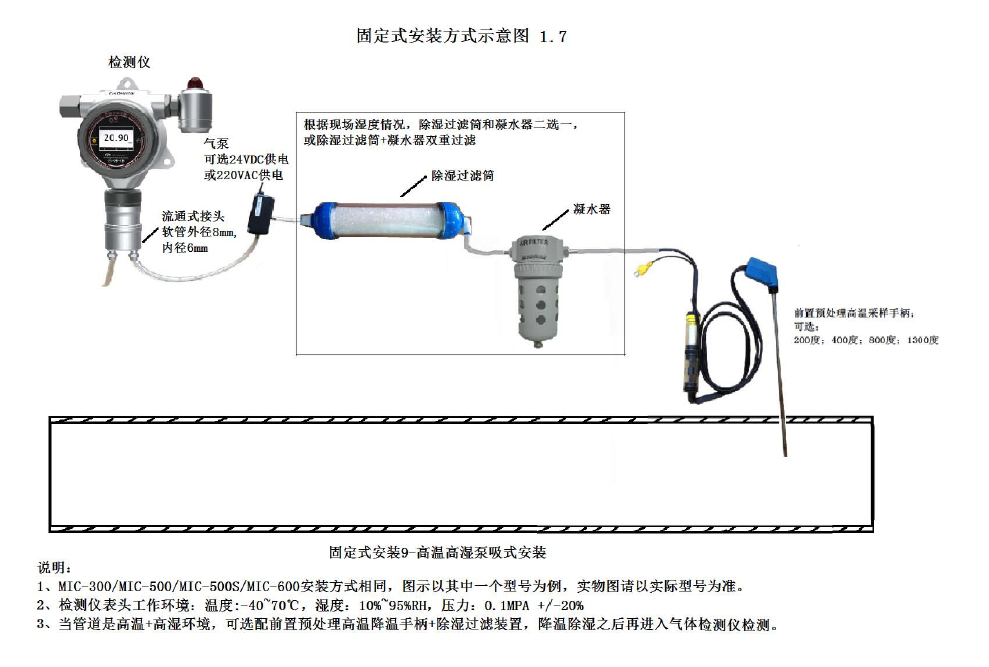 采樣單元采集現(xiàn)場的被測氣體,預處理單元對氣體進行除濕、過濾粉塵,并將被測氣體的濕度恒定在一定范圍,處理后的氣體接入我司MIC-500-CO檢測儀(配流通接頭)進氣口,進行實時監(jiān)測并顯示在儀器上,并通過信號接口將數(shù)據(jù)進行傳輸?shù)娇蛻舻谋O(jiān)測系統(tǒng)進行數(shù)據(jù)監(jiān)控。