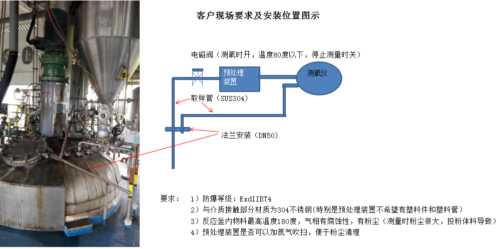 采樣單元采集現(xiàn)場(chǎng)的被測(cè)氣體,預(yù)處理單元對(duì)氣體進(jìn)行降溫、除濕、過濾粉塵,并將被測(cè)氣體的溫度和濕度恒定在一定范圍,處理后的氣體接入我司MIC-600-O2檢測(cè)儀(配流通接頭)進(jìn)氣口,進(jìn)行實(shí)時(shí)監(jiān)測(cè)并顯示在儀器上,并通過信號(hào)接口將數(shù)據(jù)進(jìn)行傳輸?shù)娇蛻舻谋O(jiān)測(cè)系統(tǒng)進(jìn)行數(shù)據(jù)監(jiān)控。