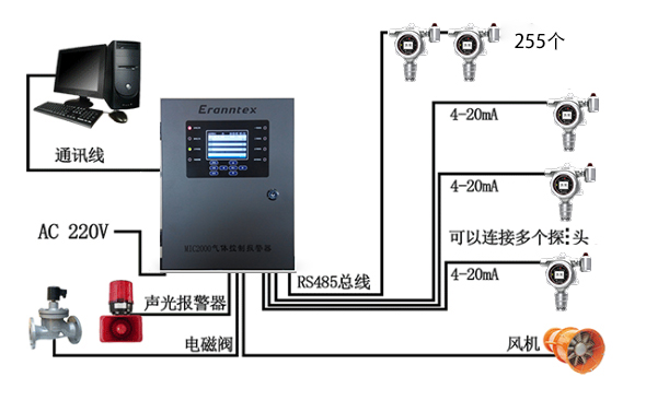 逸云天公司殘留磷化氫檢測(cè)報(bào)警系統(tǒng)包括氣體檢測(cè)探單元、信號(hào)傳輸采集單元、顯示單元(報(bào)警控制主機(jī)上集中顯示)、監(jiān)控器、控制單元、報(bào)警單元、被控設(shè)備單元(如風(fēng)機(jī)、電磁閥)組成。